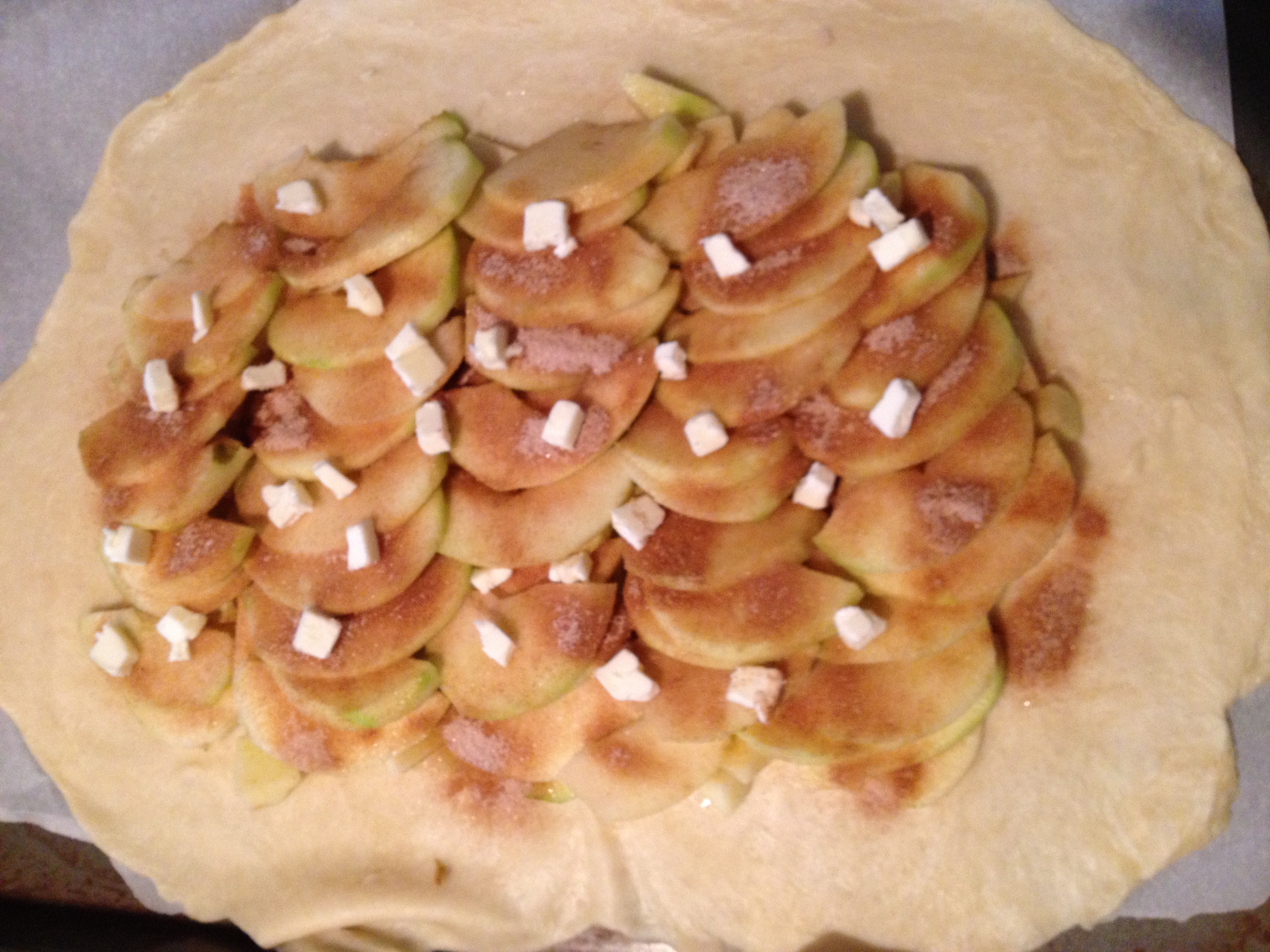- Dot the top of the galette with the remaining butter and fold up the edges. Place the galette in the oven and bake for 45-50 minutes, or until the galette is golden brown on top and the apples are soft when poked with a fork.