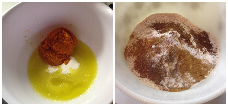 - In a large bowl, whisk together the oil and pumpkin puree until combined. Add the sugar and stir until smooth. Whisk in the eggs, beating well after each addition. Stir in 1/4 cup water at room temperature.